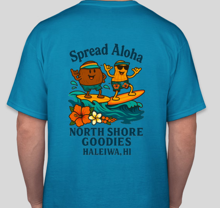 Our exclusive t-shirts feature our adorable mascots on the back and our North Shore Goodies logo on the front left chest — a perfect blend of fun and brand love.